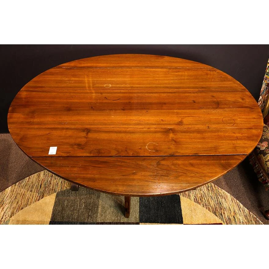 Antique Period French Provincial Walnut Tilt Top Drop Leaf Wine Dining Table circa 1750, having an oval top, the trestle base with swing out legs, and rising on shoe feet